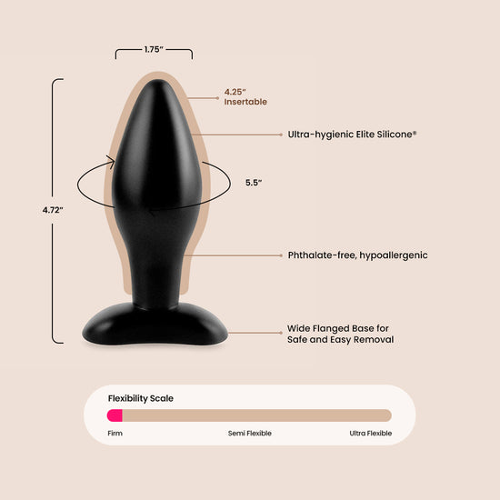 At 1.75" wide with an insertable length of 4.25' , the Medium Silicone Plug has a tapered tip for easy entry, a bulb that provides extra sensation, and a narrow neck that allows your muscles to wrap around and hold it in. The ergonomic design of the base ensures that it won't slip too far inside while still fitting comfortably between your cheeks.