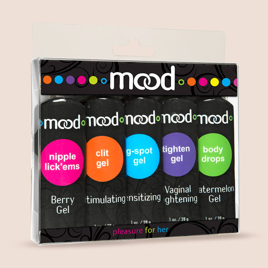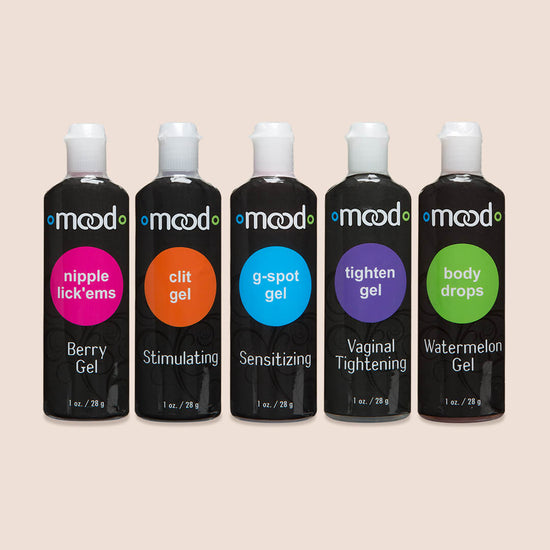 Five amazing female-focused-formulas! The MOOD Pleasure for Her multi-pack features a flavorful Berry Nipple Lick’ems Gel, an invigorating Stimulating Clit Gel, succulent Watermelon Body Drops, G-spot Sensitizing Gel, and a Vaginal Tightening Potion. Sugar-free and Proudly Made in America, each potion comes in a chic 1oz. bottle!