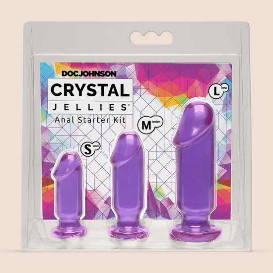 Work your way up to backdoor bliss, with the Crystal Jellies Anal Starter Kit! Perfect for beginners, each plug features a flat comfortable base for easy wearability, while the pronounced head and smooth shaft is sure to make for some jellie jammin' satisfaction! The small plug is 1" in width with a 3" usable length, medium is 1.5" in width with a 4" usable length, while large offers a 2" width with a 5" usable length. These jellies can be worn alone or used with any o-ring compatible harness. Made of phthalate-free body-safe material, with Doc Johnson's antibacterial Sil-A-Gel formula. Proudly Made in America.