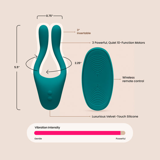 Take your intimate adventures to the next level. The TRYST line of rechargeable multi-use massagers, designed with all bodies in mind, is revolutionizing pleasure play. TRYST v2 features the same 3-motor design that made the award-winning original TRYST so popular, plus flexible silicone arms that bend and stay in position for a comfortable custom fit that targets every erogenous zone. A wireless remote control is included to make enjoyment of TRYST v2 interactive and effortless.