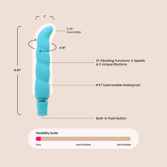 Made of pure body safe silicone, the vibrations radiate freely over the spirals and the ergonomic g spot curve. Purity G has a waterproof motor to ensure safe shower play. To cleanse Purity G run water and apply a mild soap or wipe with a choice toy cleaner, then let air dry. Enjoy peace of mind with our 5 year warranty!