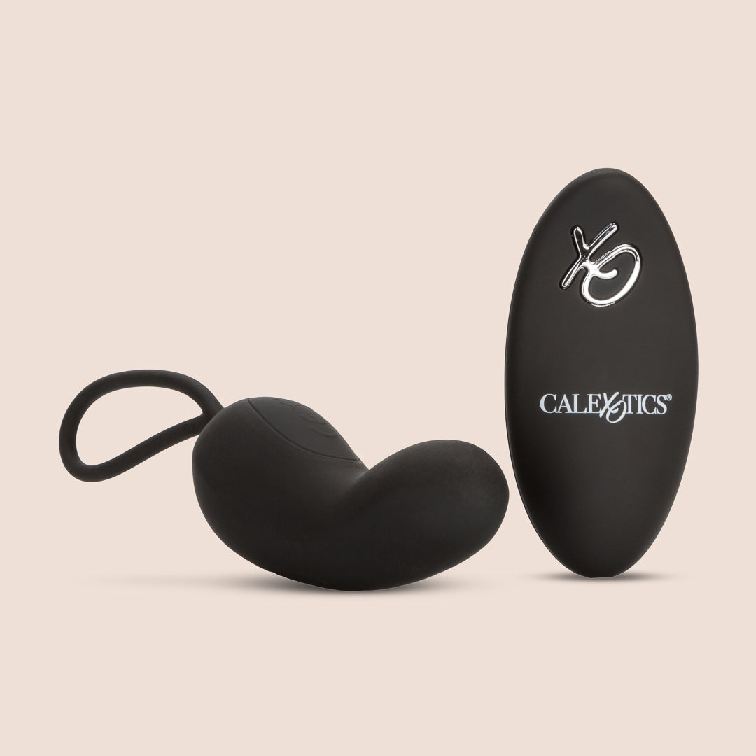 Easy retrieval cord. Instructions included. Easy-to-use push button control. Extended range: 32.75'/10m range. USB rechargeable (stimulator and remote). Complete charge in 1 hour. Egg runs for 40 minutes on high speed and 70 minutes on low speed; Curve runs for 90 minutes on high speed and 120 minutes on low speed. Waterproof stimulator. Materials: Silicone (stimulator) ABS with PU Cote (controller, decor) ABS with Silver Plating (button). 3" x 1.25".
