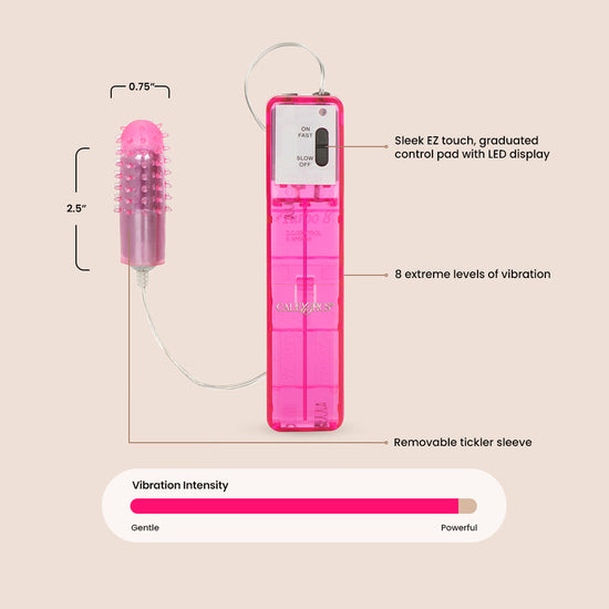 Eight levels of powerful stimulation delivered by an Action Arouser! The pink bullet has an exquisitely textured, soft, supple, removable Silicone clear sleeve. The easy touch control pad with LED display has a contoured case for ergonomic versatility. Uses 4 AA size batteries, not included. The power behind this Action Arouser is indescribable... it will take your breath away!