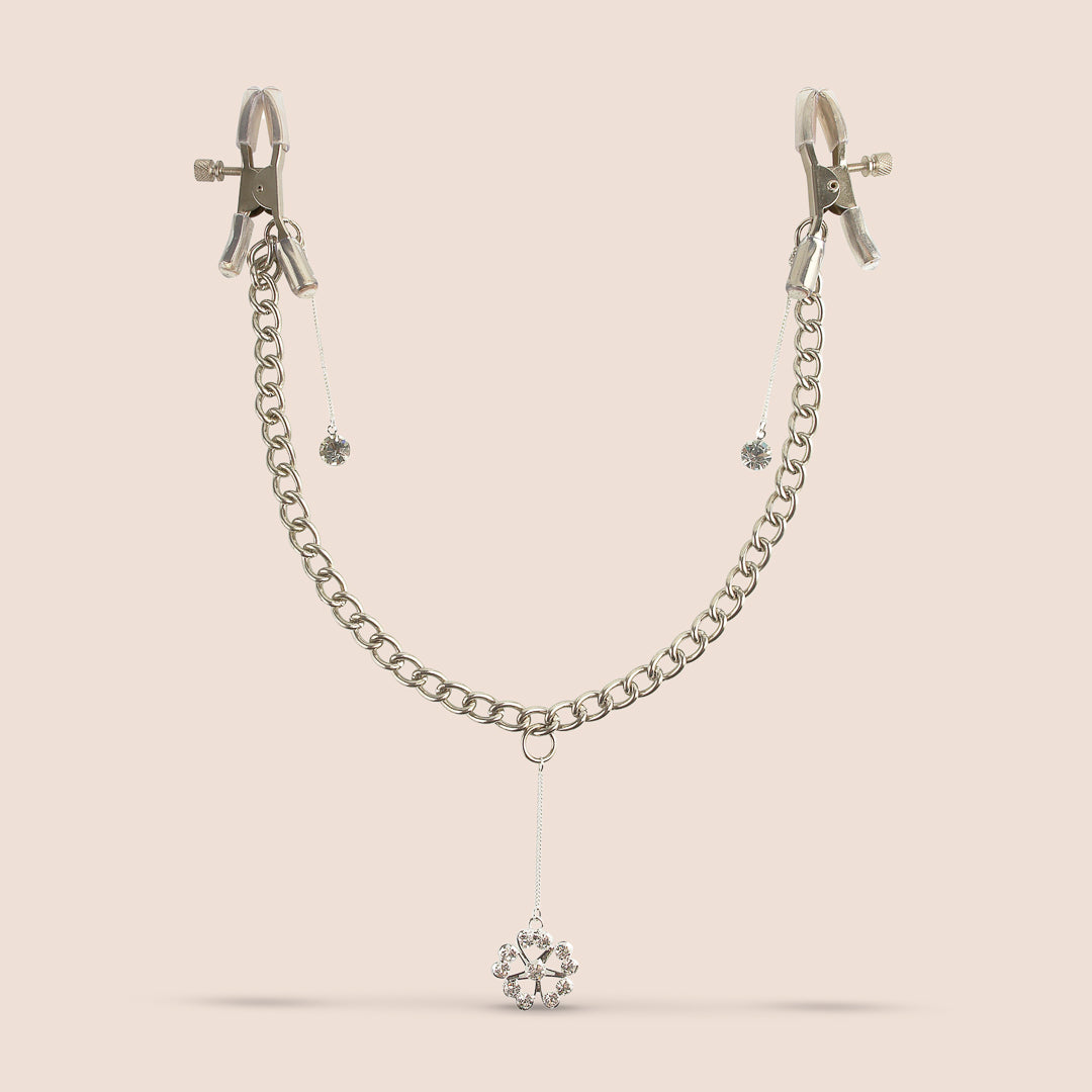 Make your nipples perk with pleasure with these beginner-style Crystal Nipple Clamps. Made with durable metal clips and covered in soft rubber liners, these clamps are perfect for beginners and fetish enthusiasts alike. The amount of pressure you apply to the nipple is adjustable by turning the screw, while the hanging crystals add a touch of elegance and style!