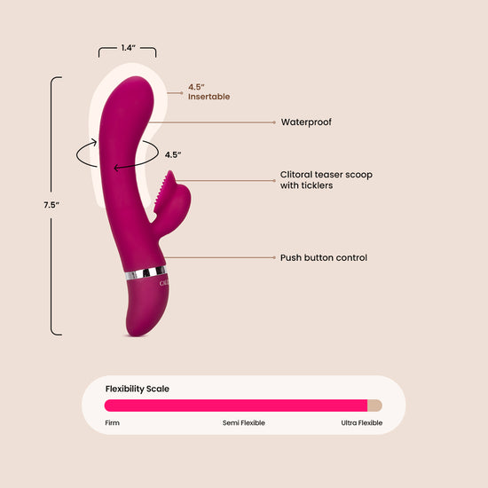 Enjoy the unlimited tantalizing pleasure with the power-packed Foreplay Frenzy Bunny stimulator. The erotically contoured vibe is contoured for ultimate comfort, extended reach and flexible movement with your body, and features a curved accentuated G-spot precision tip, and an ergonomically shaped clitoral teaser scoop with tantalizing ticklers. Dual motors power up 12 functions for an unforgettable orgasmic experience every time.