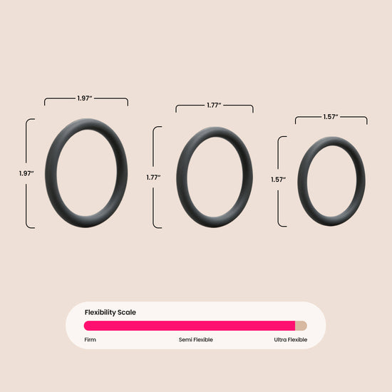 Optimize your experience with these silicone c-ck rings! The OptiMALE C-Ring Set offers enhanced size and girth with three rings in 40mm, 45mm, and 50mm diameters. These rings are ultra-stretchable for easy use around the shaft or testicles, maintaining those long-lasting erections you’ve always dreamed of, and prolonging your ejaculation. Available in Black and Slate; phthalate-free silicone.
