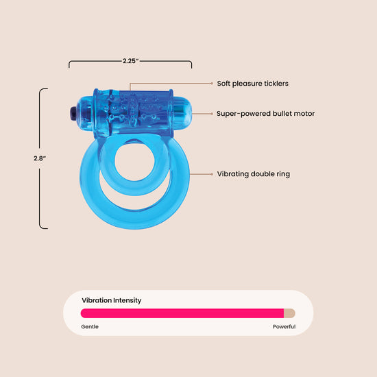 Super-powered vibrating double ring. The DoubleO 6 vibrating ring features two specially positioned rings for an extra-secure fit – simply stretch one around the shaft and the other around the testicles. Featuring a super-powered bullet motor and raised pleasure ticklers, the DoubleO 6 gives couples super-powered pleasure right where it counts!