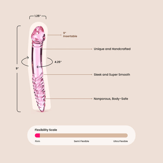 Enjoy double the fun with this elegant double-sided glass massager. Each end features a tapered tip to ease insertion while cleverly curved for explosive G-Spot or P-Spot stimulation. Either end boasts unique textures--a bulbous head and a ribbed swirl--that offer endless possibilities for pleasure! The hypoallergenic glass is nonporous, body safe, and, when cared for properly, is designed to last a lifetime.