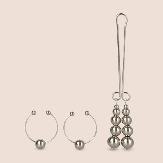 Decorate your body and get your lover's undivided attention with Nipple and Clit Jewelry. This sexy, non-piercing, non-tarnishing nickel free set contains a pair of classic silver nipple rings with a bead on each, as well as a clit decoration, which gently grips the clitoral area or inner lips for some tantalizing sensation as well as eye candy. All can be adjusted to fit most sizes.