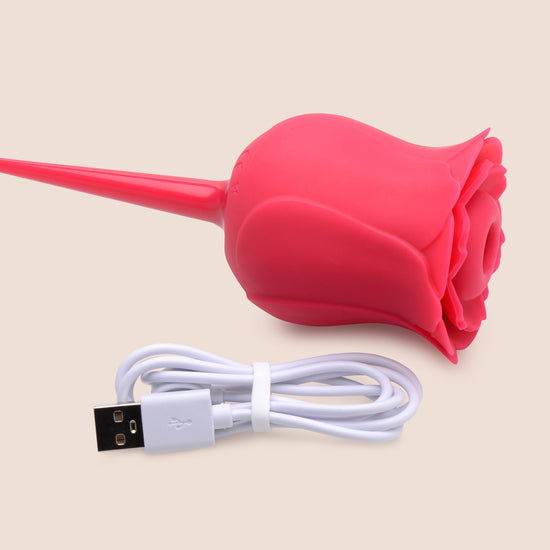 Blossom with pleasure with our Bloomgasms Sucking and Vibrating Rose! This little flower packs a powerful punch with its air pulsing and vibrating capabilities. Whether you want to stimulate your clit or nipples, this handy toy has got you covered with 5 air stimulation modes and 7 vibration functions. Plus, it's made with plush and addicting silicone and is phthalate-free for worry-free playtime. And with its IPX5 splashproofing, you can even take it in the shower for some steamy fun. And when it needs a pick-me-up, just use the included USB charging cable to keep this Rose at its peak performance. So go ahead and explore your sexuality with this naughty little flower - we promise you won't be disappointed!